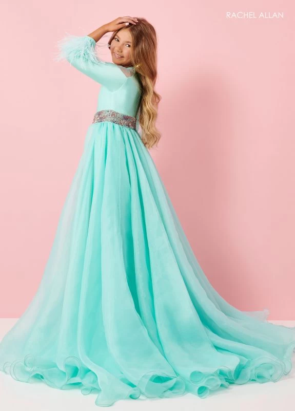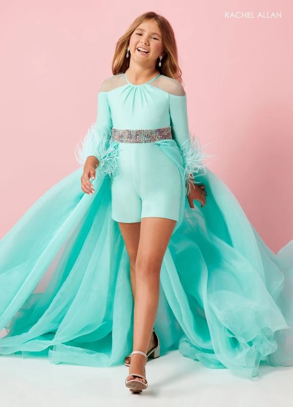 Rachel Allan 10179 slim little girl pageant romper in luxe lycra jersey features a gathered jewel neckline, an illusion cold-shoulder, and a zipped-back closure. A floor-sweeping overskirt with a curly hem flows from the beaded waistband of this mini pageant romper, complete with three-quarter sleeves and ostrich feather cuffs.