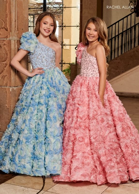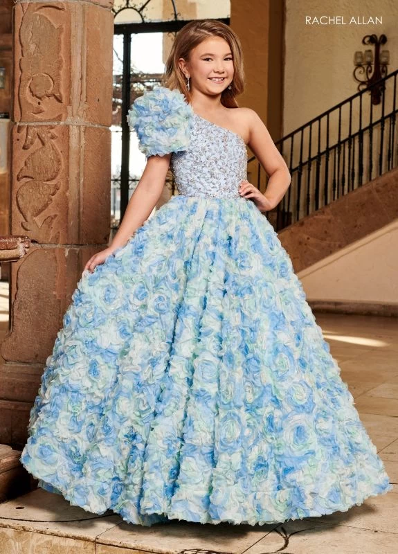 Rachel Allan 10192 little girl embroidered tulle ballgown features an asymmetrical neckline and one-shoulder short puff sleeve with 3D floral appliques. This mini pageant dress has a beaded bodice with floral pattern, a skirt covered in three-dimensional floral appliques, a horsehair hem, and a brush train.