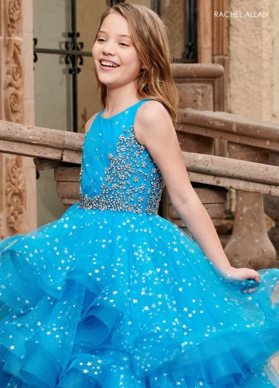 Rachel Allan 10198 mini ballgown in multi-tiered ruffle tulle features a scoop neckline, a cutout back, and a bodice intricately crafted with rhinestones. This little girl pageant dress with stars printed all over has detachable sleeves, a horsehair hem that gives every layer of the skirt more volume, and a court train to complete the look.