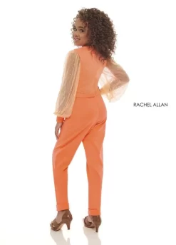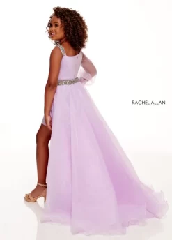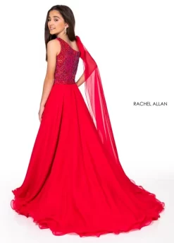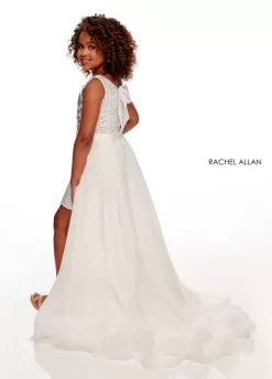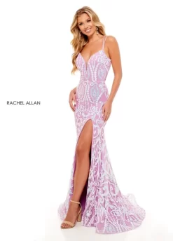 Rachel Allan 70279 formal gown in sequin tulle features a plunging neckline with a mesh insert, double spaghetti straps, and a cutout laced-up open back. This slim-flare long party dress has a thigh-high slit, a horsehair hem, and exits with a sweep train.