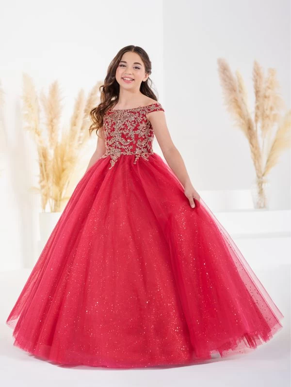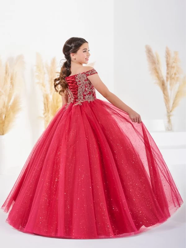 Tiffany Princess by Christina Wu 13687 wine rosegold little girl pageant dress features a beaded lace-appliqued bodice with an off-the-shoulder straight neckline. This glitter tulle ballgown finishes in a fully gathered skirt and a laced-up back.