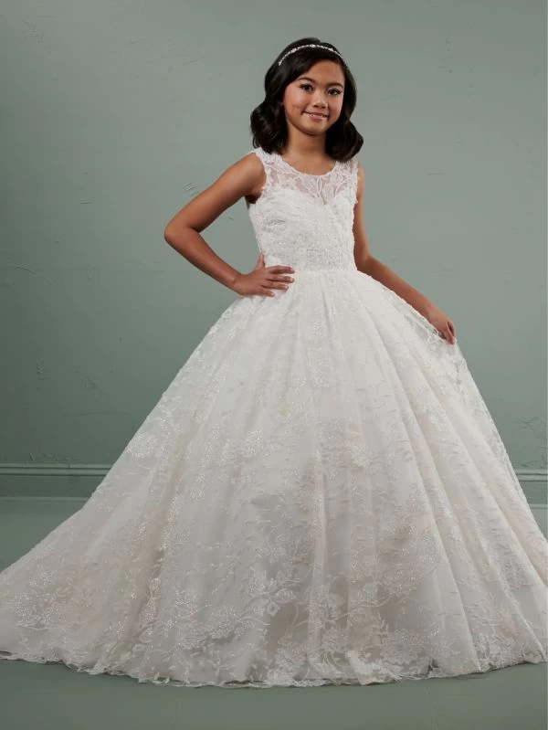 Tiffany Princess by Christina Wu 13710 ivory little girl pageant dress is fashioned in floral glitter mesh, with an illusion scoop neckline and a laced-up back. A detachable back bow adds charm to this sparkly mini ballgown, finished with a sweep train.