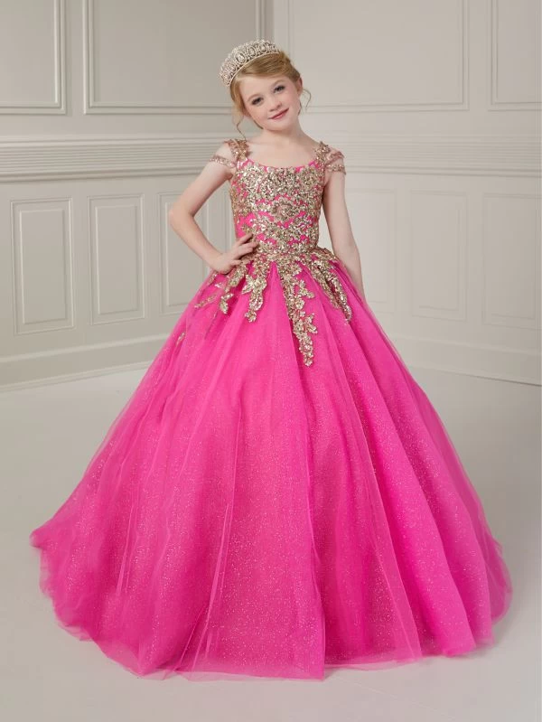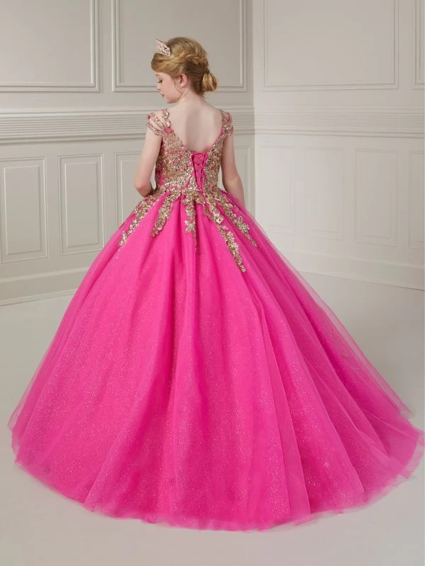 Tiffany Princess by Christina Wu 13732 fuchsia gold little girl pageant dress is fashioned in sparkle tulle, with a semi-scoop neckline and triple straps. Sequin lace appliques stretch from the bodice to the gathered topskirt of this mini ballgown, finished with a laced-up scoop back and a sweep train.