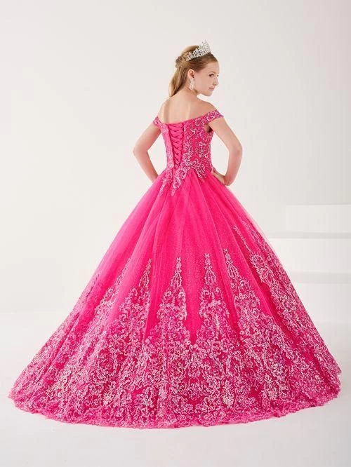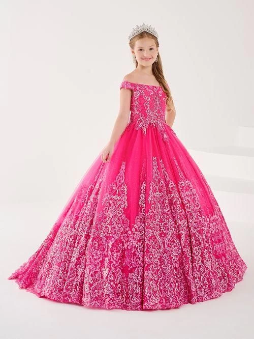 Tiffany Princess by Christina Wu 13738 glitter tulle little girl pageant dress features an off-the-shoulder straight neckline and a laced-up back. Sequin appliques richly embellish this mini pageant ballgown, finished with a sweep train.